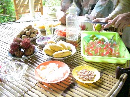 観光の途中で一休み。テーブルの上には色んなトロピカルフルーツが置いてあった。(写真右)