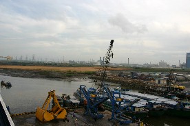 着岸したブンタウ港の眺め、遠くには石油コンビナートのような工業地帯が見えた。(写真左)