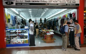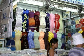 市場の入り口近くにあった衣料品店、色鮮やかなアオザイが展示されていた。(写真左)