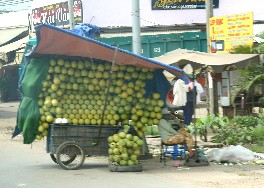 しかし、この国では人間の力も主要な移動手段だ。日本では忘れ去られた天秤棒で荷物を運ぶ姿を何回も見かけた。(写真左)