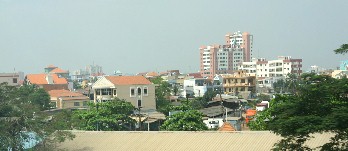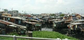 これは湿地帯(と言うより下はメコン川の一部)の上にビッシリと建ったトタン葺きの家々。最下層に暮らす人達の家であろうか。(写真右)