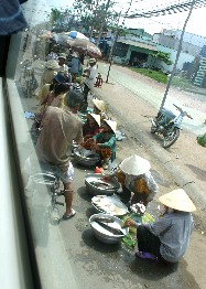 周辺の川で獲れた魚であろうか、たらいや洗面器に色んな魚を入れ、道行く人に売っていた。(写真左)
