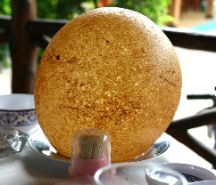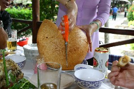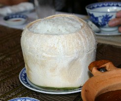 ベトナムで最後の食事となった。昼食を食べたこのレストランでは椰子の実の中にご飯を詰めて炊いていた。(写真左)