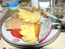 朝食はビュッフェ形式だった。日本には輸出されていないというドラゴンフルーツがデザートの