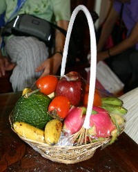 盛り籠いっぱいのフルーツは、この日誕生を迎えた人へのホテルからのプレゼントだった。(写真右)