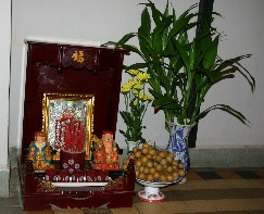 商売繁盛を願っての祭壇であろうか。店の片隅にはこんなものが置かれていた。(写真右)