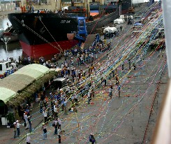 れながら岸壁を離れた。夕闇が迫る岸壁で紙テープが風に舞っていた。