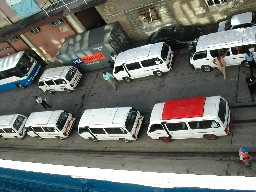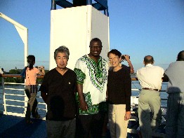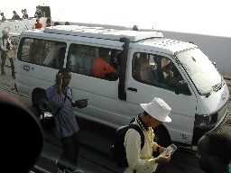 港に着岸すると、この国にあるサファリカーをすべて動員したのではないかと思われるような長い車の列が待っていた。(写真左)