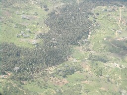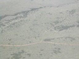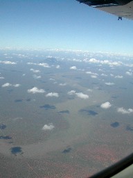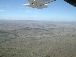 延々と続くアフリカの大地。総じて乾燥した気候のためか緑は少ないようだ。帯状に見える森は椰子林だろうか。(写真左)
