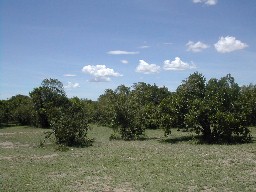 草原には蟻塚が多く、蟻塚の跡にはこのような木々が根を下ろしていた。(写真右)