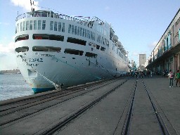 モンバサ港に停泊中のトパーズ号。(写真右)
