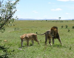 ライオンは繁殖期以外、雄と雌が一緒にいることはない。この時は昼寝から覚めた雄雌が私達の目の前で交尾を始めた。(写真右)