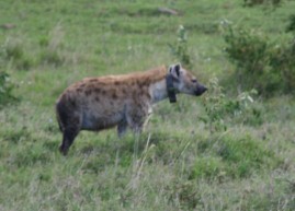 反対に姿形が非常に不格好なハイエナ。首には観察用の無線の発信器が取り付けられているようだ。(写真右)