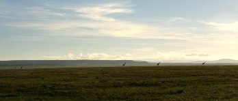 草食動物の群の遥か向こうには、かつての造山活動で出来たと思われる長い丘陵地帯が見えていた。(写真左)