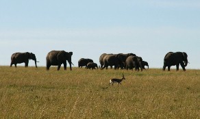 象の群に守られるようにして移動しているトムソンガゼル。(写真左)