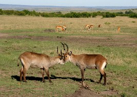 レイヨウの雄同士が角付き合わせていた。背景にいる雌ばかりの集団の取り合いだろうか。(写真右)