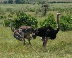 ダチョウも草食動物たちと同じように恋の季節を迎えていた。盛んに左側の雄が右側の雌の気を引こうと求愛ダンスをしていた。(写真左)
