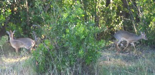 疎林の中に身を隠すようにしている小さな草食獣ディクディク。(写真左)