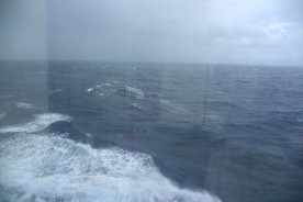 大荒れに荒れた海、デッキには出られなかったので7階の窓から写した。