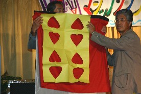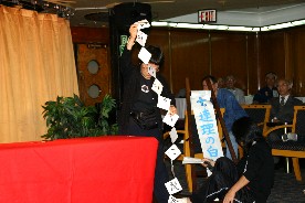 Oさんは蝦蟇の油売りに扮しての出演。かけ声もと共にカードが変化。(写真左)
