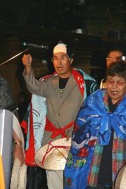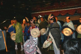私達は箱根八里の半次郎を三度笠姿(?)のつもりで歌った。(写真右)
