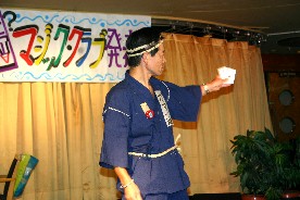 Mさんは先生級のベテランマジシャン、安心して見ることが出来ました。破った紙が復元するマジック。(写真左)