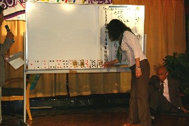 私はIさんの介添えでカードマジック、この紙の模様が選んだカードと同じように変化。(写真左)