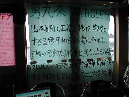 海は荒れていた。横揺れ縦揺れが激しい甲板上で憲法九条の写真撮影が行われた。(写真左)