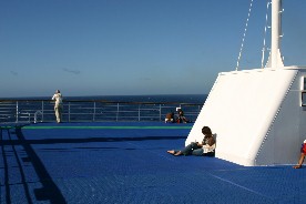 昼間の船首デッキは人影も少なく、穏やかな日射しの中でゆっくりと時間が流れていく。(写真左)