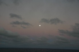 日没後の空にはきれいな満月が出ていた。船の上での月見も良いものだ。