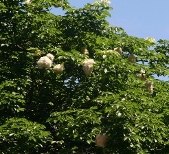 この木の枝先にある白い綿毛のようなものは何だろう。木の実がはじけ中から出てきたもののようだ。(写真右)