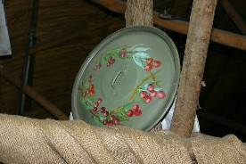 梁がむき出しになった建物(写真左)と、その梁に立てかけられていた鍋の蓋。(写真右)