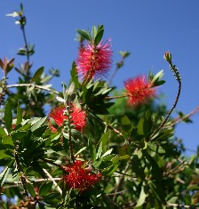 ブラシの木に良く似た赤い花(写真左)と広大な畑。レストランの外はこんな景色だった。(写真右)