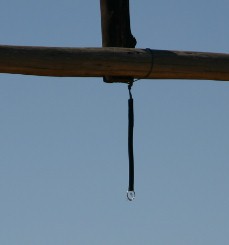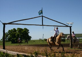 乗馬の最大のイベントは写真のように、ぶら下がった小さなリングを走り抜けながら指先に通す競技だ。(写真左)