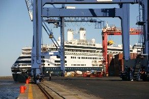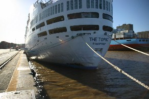 そして、港内の風景。よその国の客船が近くに停泊していた。(写真右)
