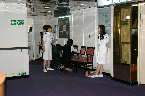 港の中は専用バスで移動した。(写真左)