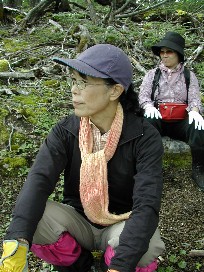 まだまだ先は長いが腰を下ろすような場所はなく立ったままでの休憩だった。後ろ姿はガイド嬢(写真右)