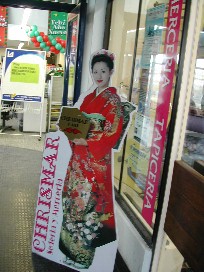 何を売っている店(写真屋さん?)か忘れたが和服姿の看板が。(写真右)