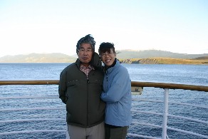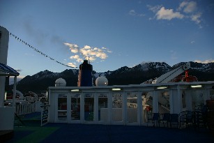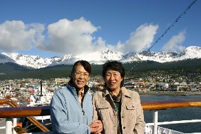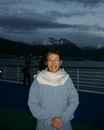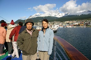 すっかり日が落ちてしまったデッキで家内と私はお互いの記念写真を写した。さようならウスアイア。(写真左、右)
