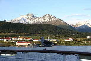 船に戻り、デッキに出てみるとデッキの手すりにカモメが一羽とまっていた。その向こうには夕闇迫るウスアイアの町