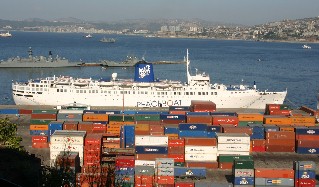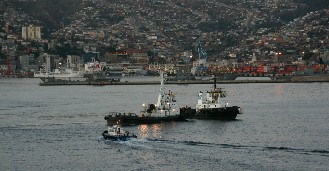 港には貨物船などの他にチリ海軍の船も何艘か停泊していた。タグボートが巻き上げる海水