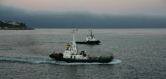 トパーズ号が港に近づくと迎えのタグボートや税関の船が近づいてきた。(上の写真4枚)