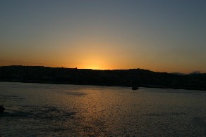 港の向かい側の山からは朝日が昇り始めた。(写真左)
