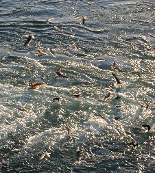 海ではカモメやペリカンたちが船が巻き上げる海水の中にダイブしていた。餌になる魚でもいるのだろうか。(写真右)