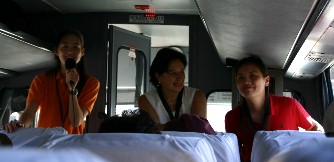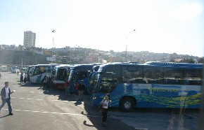 いよいよ一泊二日のツアーが始まった。港の側には迎えの観光バスが何台も停まっていた。(写真左)
