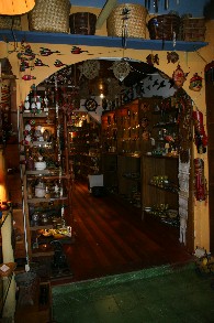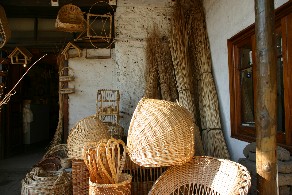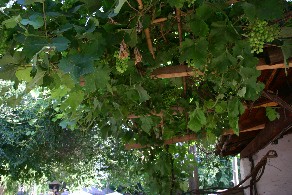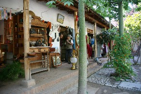 ところ狭しと民芸品を並べたお店、(写真3、4)家と家の間の路地にはアーケード替わりのブドウ棚もあった。(写真5)