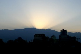向かい側の山もオレンジ色に包まれた。背後に見える高い山はアンデス山脈だろうか。(写真右)