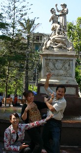 色んな銅像があったが、銅像の前でおどけてポーズをとる私達。(下の写真二枚)