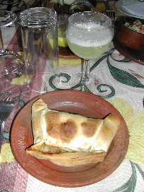 ここでもピスコサワーが食前酒として出てきた。そしてバイ生地に包んで焼いた大きな餃子の