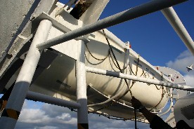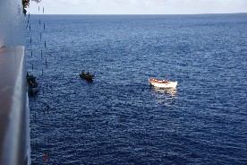 トパーズ号からは救命ボートが降ろされ、いつでも救助に駆けつけられるような体制で運搬が開始された。(写真左)